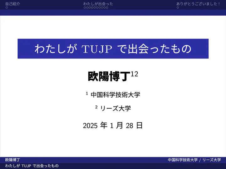 この発表は、中国科学技術大学およびリーズ大学に所属する筆者がTUJPで得た経験をまとめたものです。仙台の自然や文化に触れ、国際交流を通じて視野を広げ。