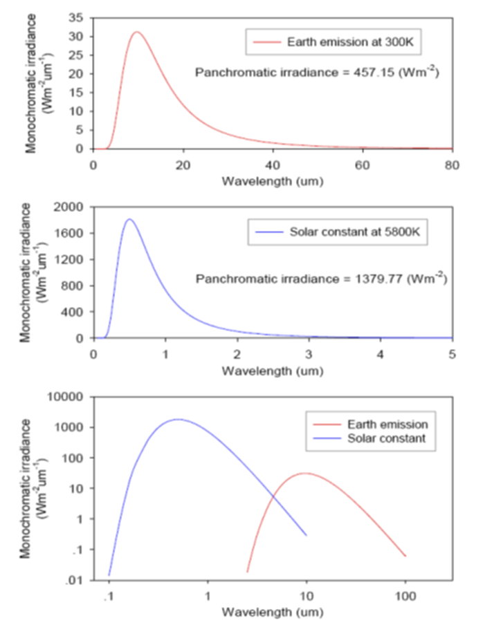 - 太阳辐射(~6000K黑体辐射),地气系统(~300K),4 um以上太阳贡献极少,长波在4 um以下极少,所以辐射传输模式可以分开独立计算